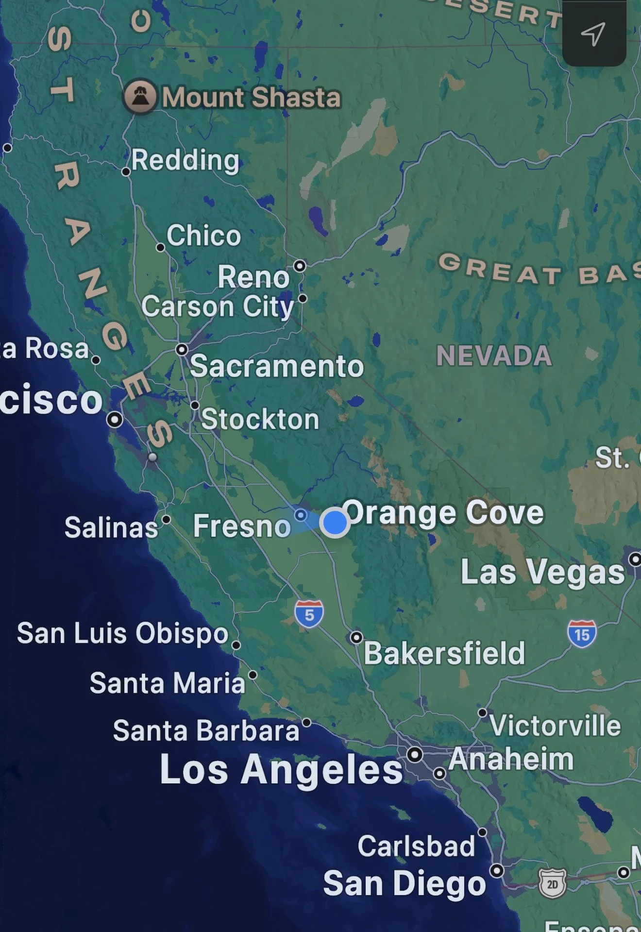 This view is from a foothill near the Mulholland Citrus Ranch outside of Orange Cove. Not only are the white capped Sierra Nevada Mountains visible but also the citrus groves that comprise much of the agricultural land in the area. Those tall white poles are wind machines to keep the crops from freezing in low temperatures.