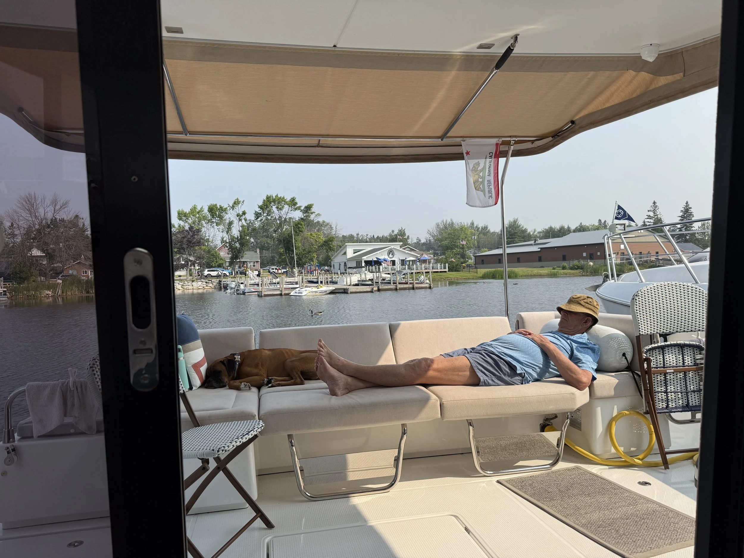 The Boat also has to be fueled, oil and coolant checked, etc. every time we launch. Almost daily Tom feels the need to wash the decks (mostly due to the bug/insect invasions). Over time we have developed a routine for taking off as well as docking. It is one thing to dock on a wall and another to fit into a slip. We have gotten better at both. There is also a routine for when we have docked - to secure the lines in a way that allows Zander to get on and off with less risk - put away the extra fnders and connect to shore power.