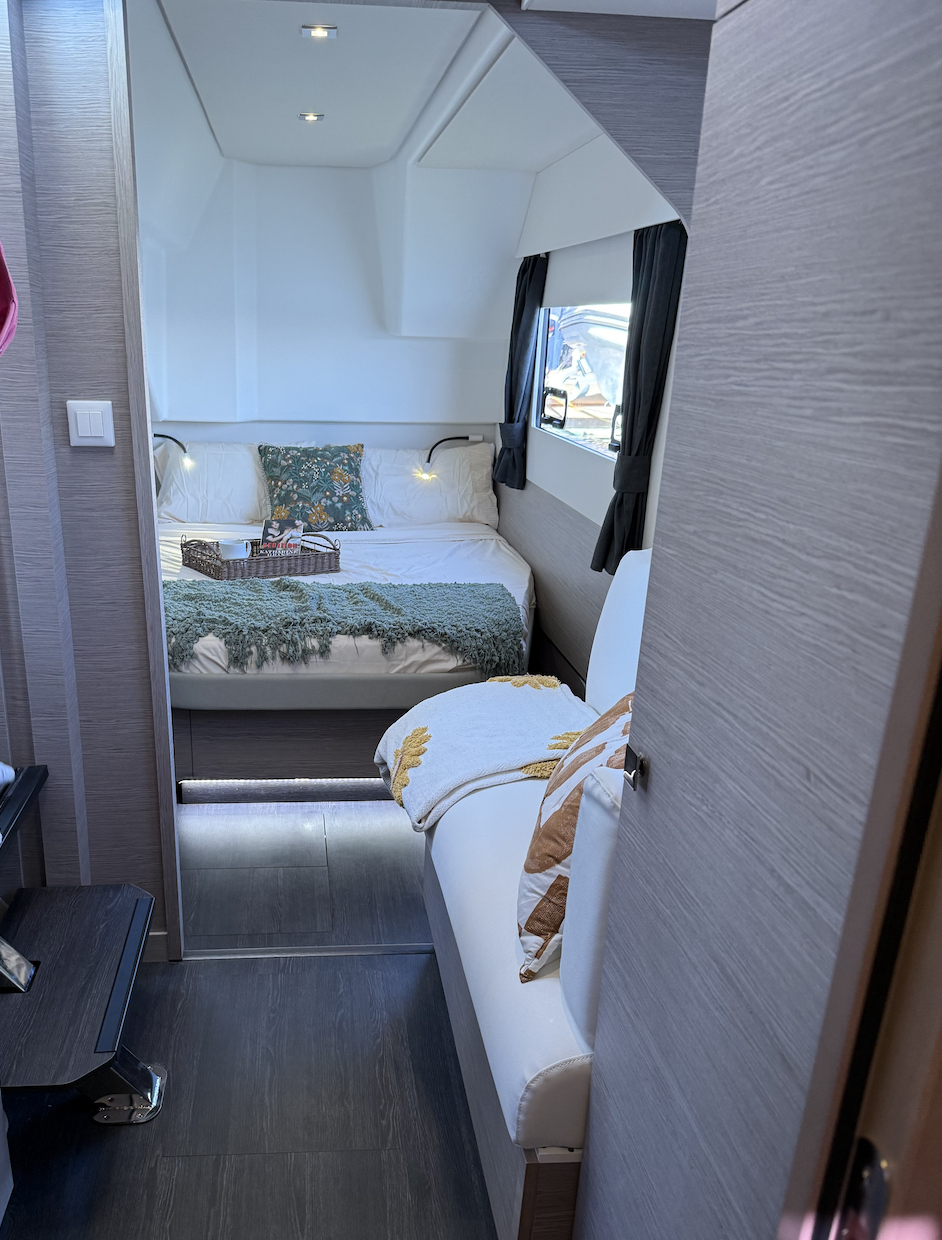 There are three berths; two on the starboard side - depicted in the above video - and the master suite on the port side. There is a head on each side.