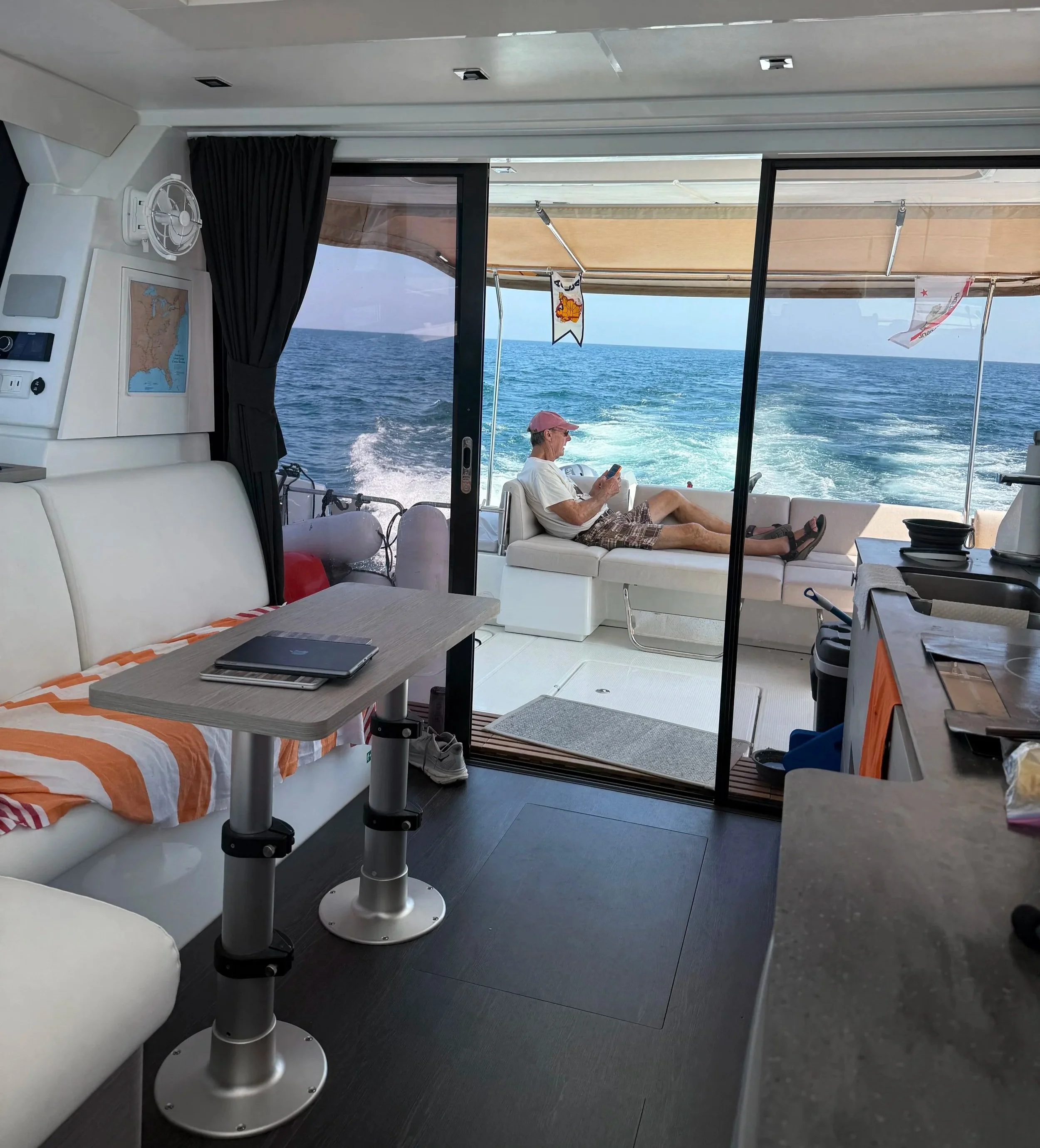 This shows how easy the crossing to Duncan Bay was - Tom is relaxing on the back of the boat with his phone.