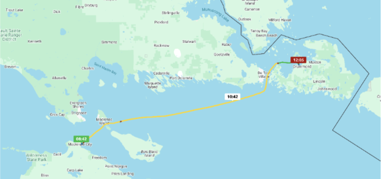From Mackinaw City to Drummond Island east across Lake Huron to the western side of the North Channel.