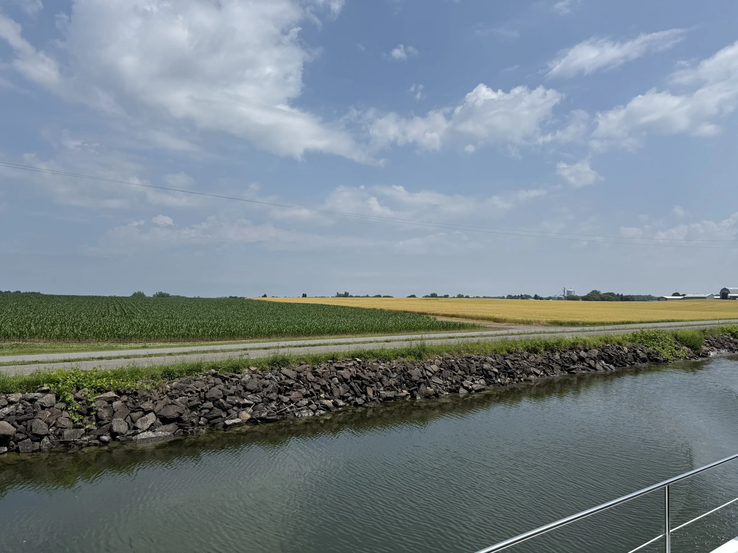 June 27, 2025: Tom faced a number of challenges with the day’s schedule, primarily, the fact we had to travel roughly 60 miles through a number of locks and lift bridges. There were also nice stretches of rural area; however, the speed limits on the canal are 10 mph and 5 mph. Did we get busted for exceeding the speed limit? Yes, at least twice and probably three times but no penalties were assessed other than we were made to wait. We did reach the Seneca River, which is essentially the end of the Erie Canal.