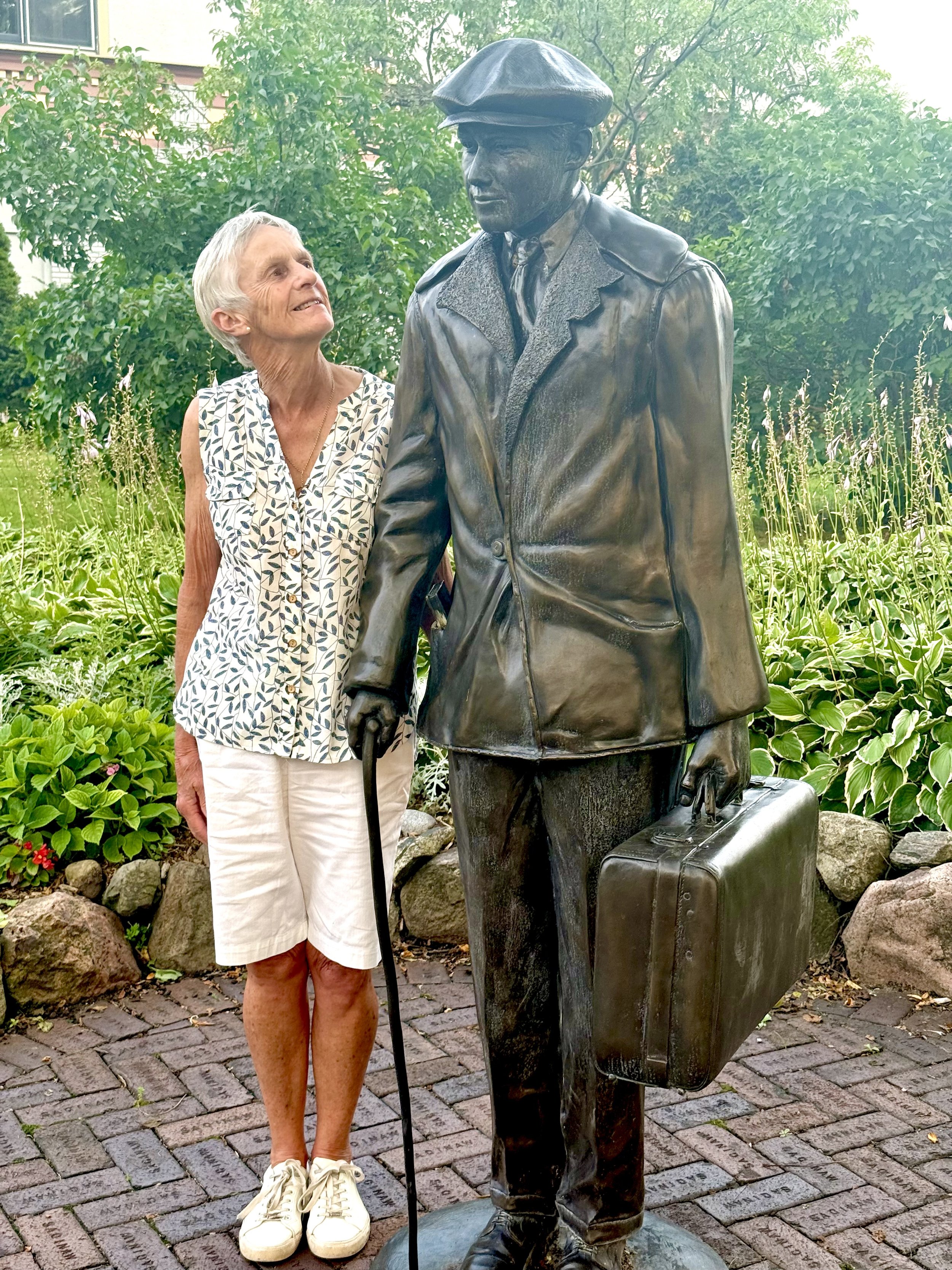 Liz with a statue of Ernest Hemingway in Petoskey during our after-dinner stroll through town.