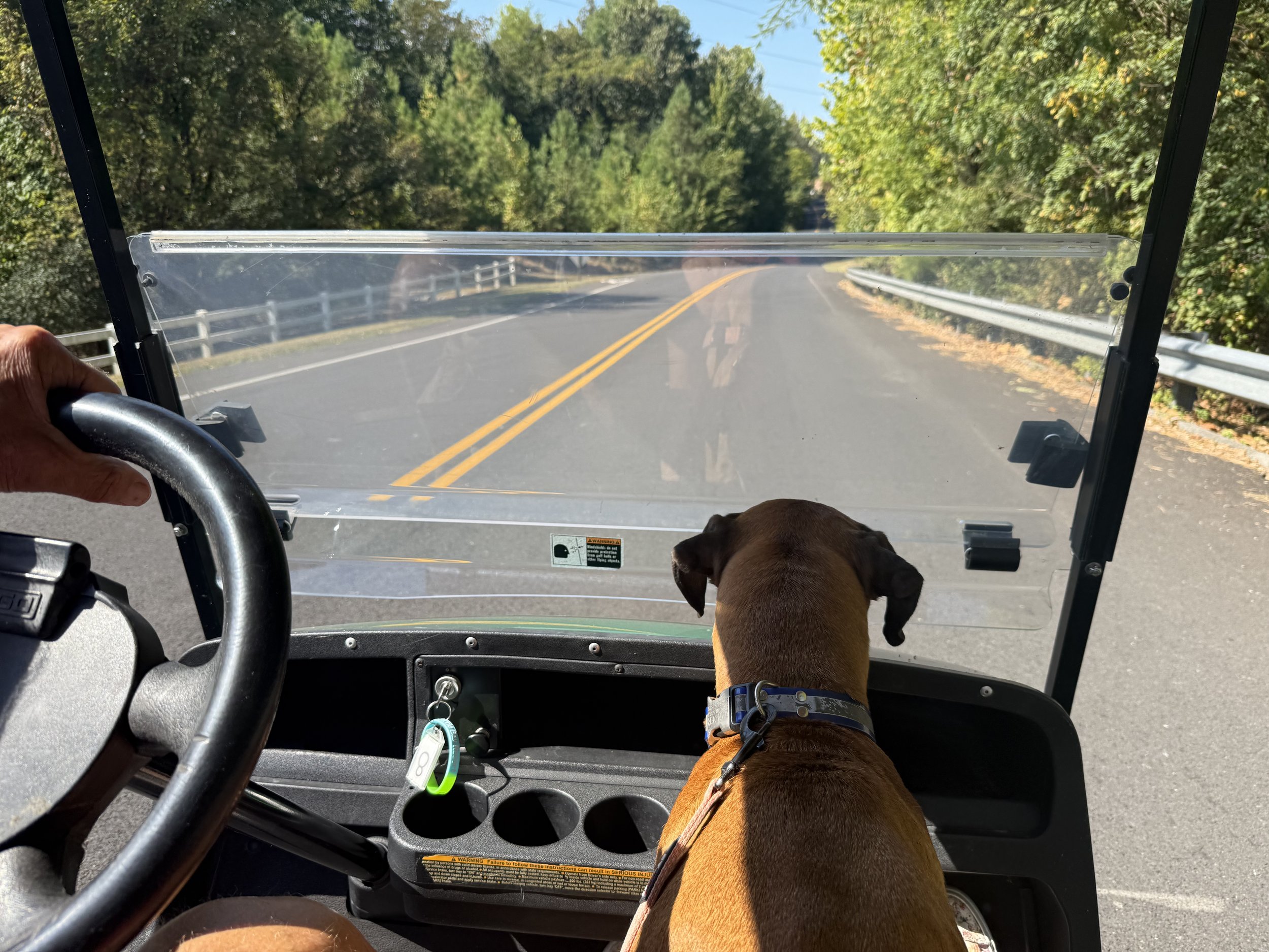 Zander sitting shotgun in the golf cart we use to get around Grand Rivers.